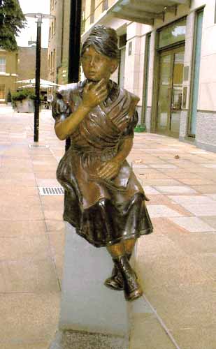 by Allister Bowtell About two years ago, Gill Nunn rang me to ask if I would talk to Stuart Corbyn of the Cadogan Estates about something to go in the new Duke of York's development opposite Peter Jones. Wearing yellow hard hats and wellington boots, Stuart took me on a tour of the building site and showed me all the exciting plans. I heard that several hundred years ago the Cadogan family had sold the site to the Army, and had only just brought it back from them. In 1803, the then Duke of York founded a school on the site. The Duke of York's Royal Military Asylum, and it was there for over a hundred years until it was relocated in Dover where it still is, celebrating its double century this year. I began to form the idea of a pupil in about 1820, leap-frogging over a Chelsea bollard, trying to impress a girl sitting on a plinth who is pretending not to see him. With considerable courage, Stuart Corbyn instructed me to proceed. The school in Dover had a museum with uniforms, paintings and prints, so off I set with my trusty camera and was entertained by the headmaster and a school dinner (a much better one than when I was at school) with the senior pupils. The next problem was the bollard. With the help of David LeLay and the Chelsea Society, I found a perfect 1814 bollard near Hans Street. Gabby and Chris Nash took a a mould of it, which was then cast into fibreglass on to which I could build the armature for the clay sculpture. At the same time, I was liaising with Robert Meyers and Elizabeth Banks Associates, the landscape designers, to get the plinth for the girl statue to blend with the detailed ground plan. When the measurements were finalised, I built a wooden pattern again for my to model the mud girl on. About six months later, the muds were approved, and Gabby and Chris Nash could get on with the casting in bronze. The next decision to be made was what words were to be carved on the plinth. The school, of course, wanted and entire literary masterpiece, but the surface area of the site wasn't big enough. Stewart settled on a subtle and discrete few words, and I asked Richard Kindersley to design and carve the layout on the stone plinth. Prince Andrew, Duke of York, who was introduced by Lord Cadogan, opened the site on the 19th March, accompanied by a costume masquerade provided by the school. |